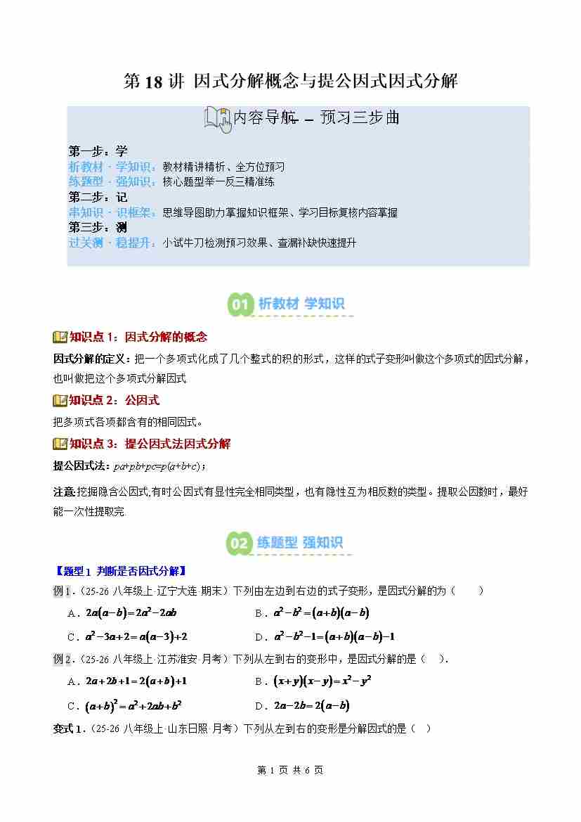 ②寒假预习-第18讲 因式分解概念与提公因式因式分解(3知识点6大题型过关测)(学生版)八年级数学新教材北师大版-2026学年八年级数学寒假衔讲练