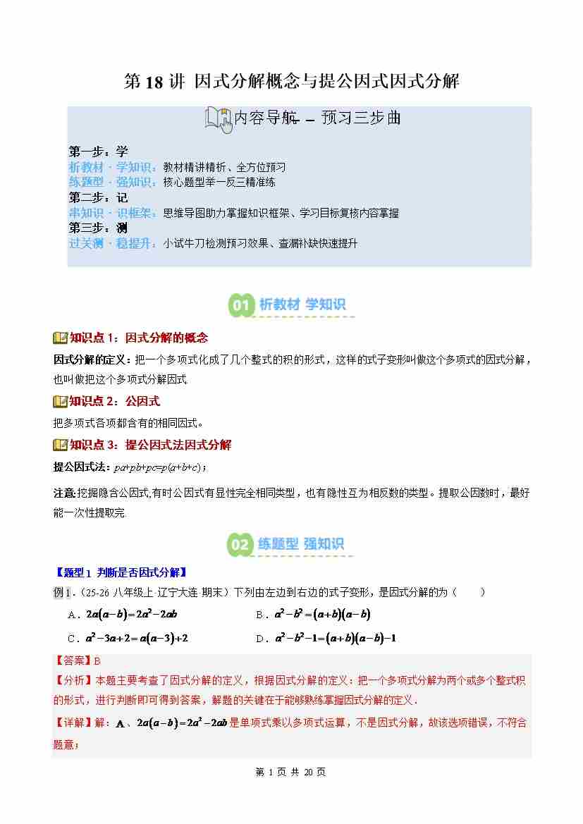 ②寒假预习-第18讲 因式分解概念与提公因式因式分解(3知识点6大题型过关测)(教师版)八年级数学新教材北师大版-2026学年八年级数学寒假衔讲练