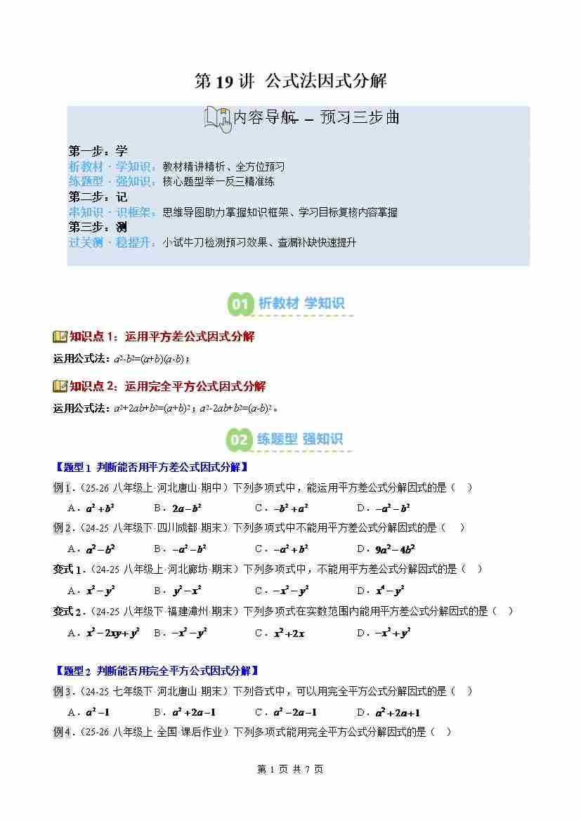②寒假预习-第19讲 公式法因式分解(2知识点7大题型过关测)(学生版)八年级数学新教材北师大版-2026学年八年级数学寒假衔讲练