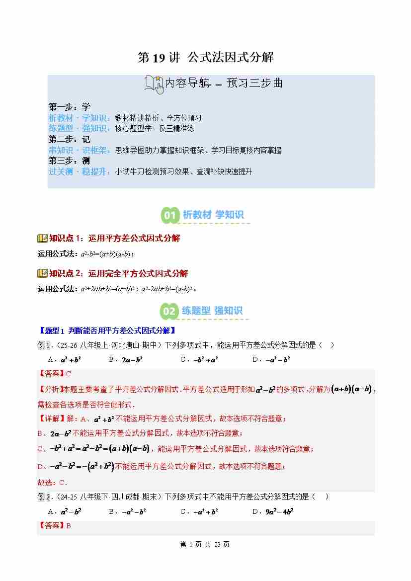 ②寒假预习-第19讲 公式法因式分解(2知识点7大题型过关测)(教师版)八年级数学新教材北师大版-2026学年八年级数学寒假衔讲练