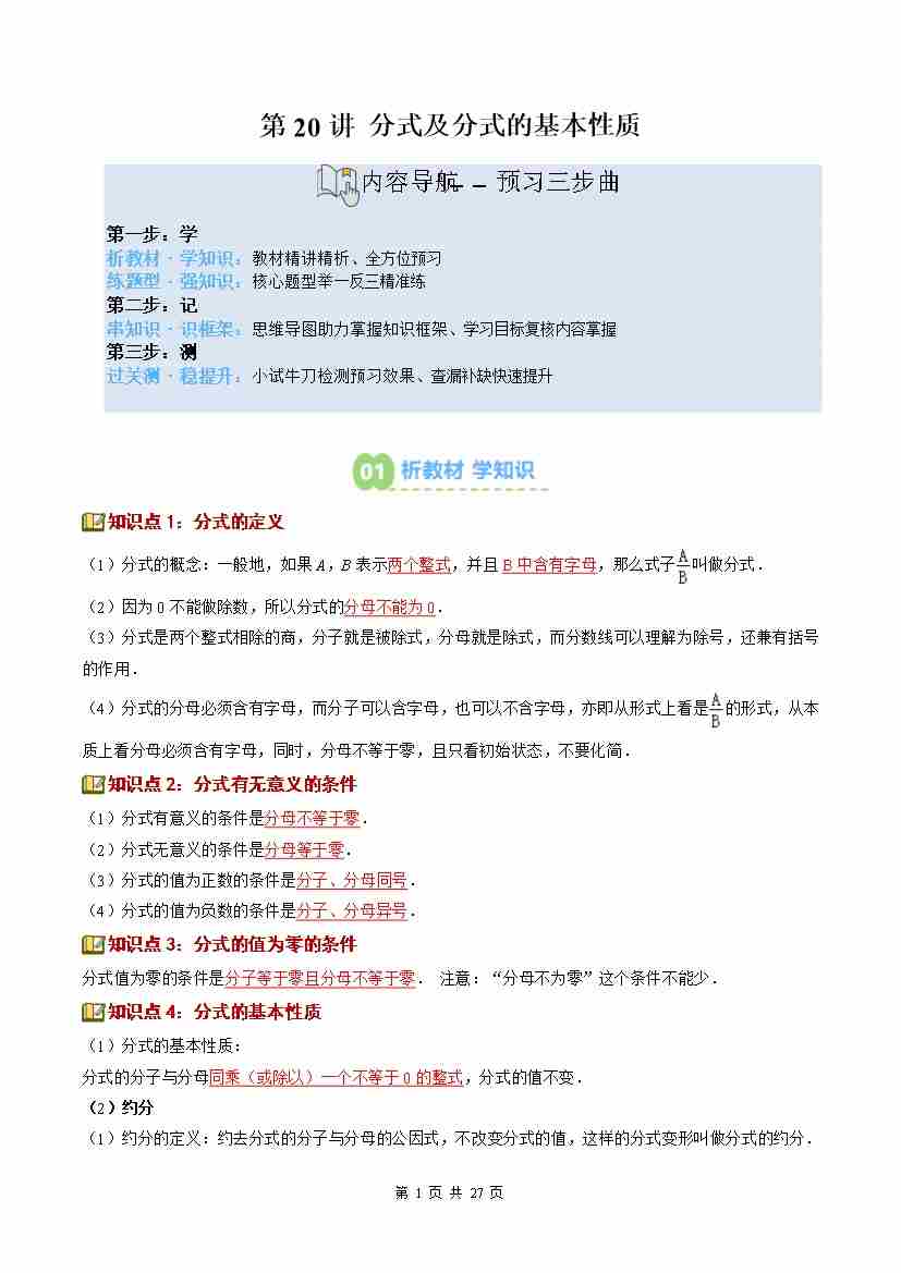 ②寒假预习-第20讲 分式及分式的基本性质(4知识点9大题型过关测)(学生版)八年级数学新教材北师大版-2026学年八年级数学寒假衔讲练