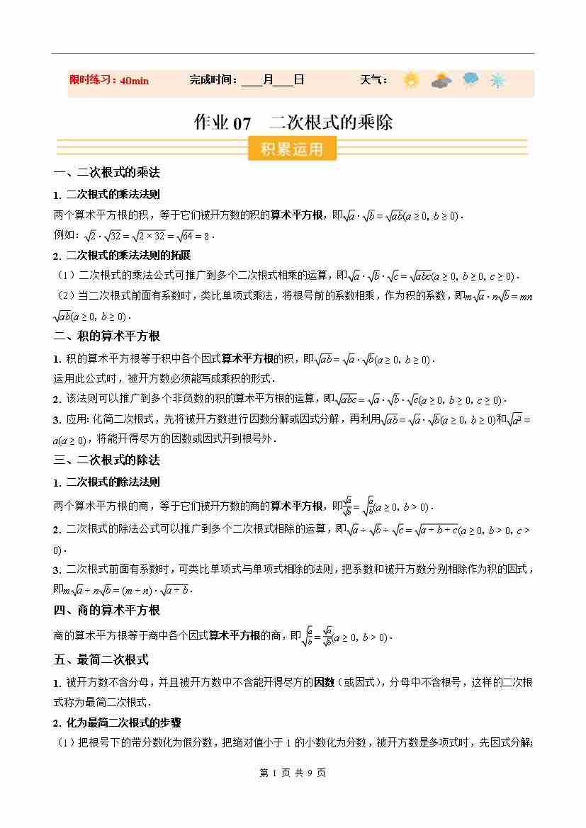 ③寒假培优练-专题07 二次根式的乘除(巩固培优)(学生版)-2026年八年级数学寒假衔接讲练 (北师大-新教材)