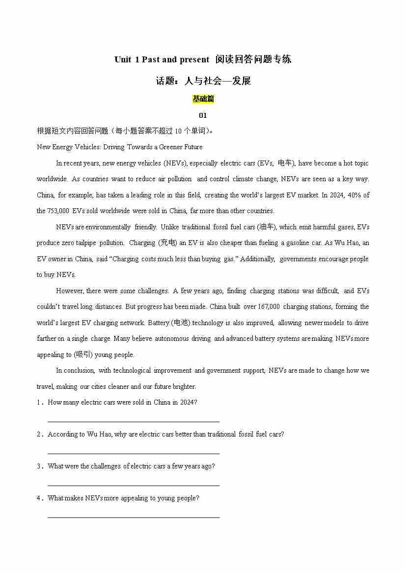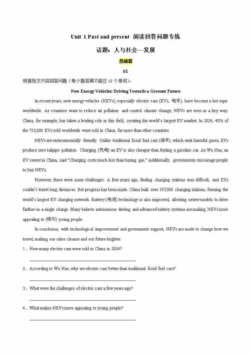 Unit 1 Past and present(阅读回答问题专练)(原卷版)
