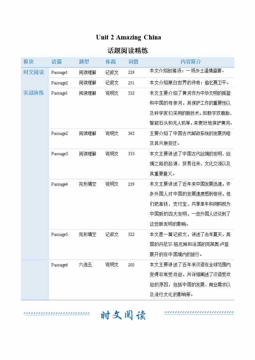 Unit 2 Amazing China(话题阅读精练)(原卷版)