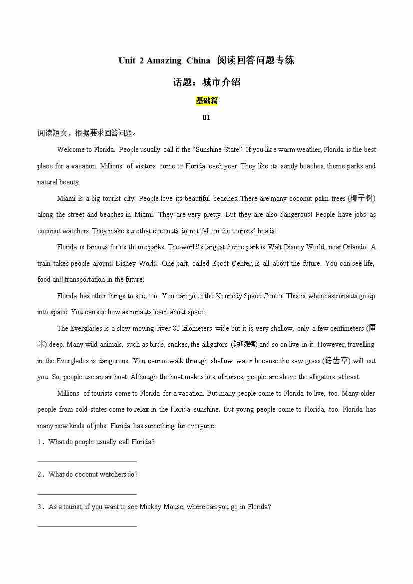 Unit 2 Amazing China(阅读回答问题专练)(原卷版)