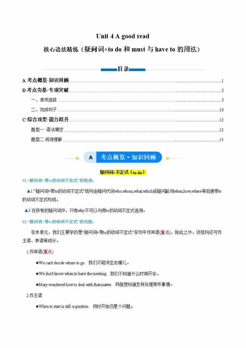 Unit 4 A good read 疑问词to do和must与have to(单元核心语法精练)(解析版)