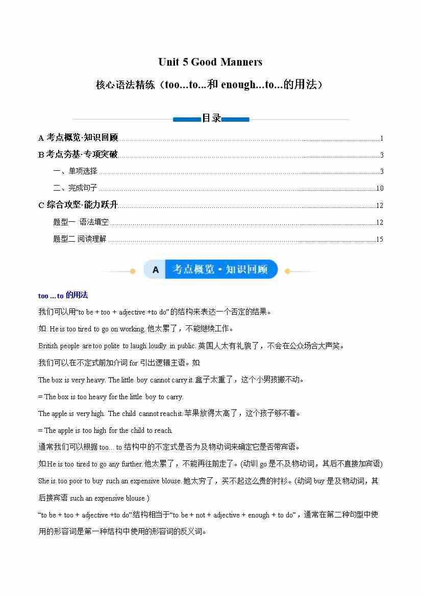 Unit 5 Good Manners too...to...和enough...to...的用法(单元核心语法精练)(原卷版)