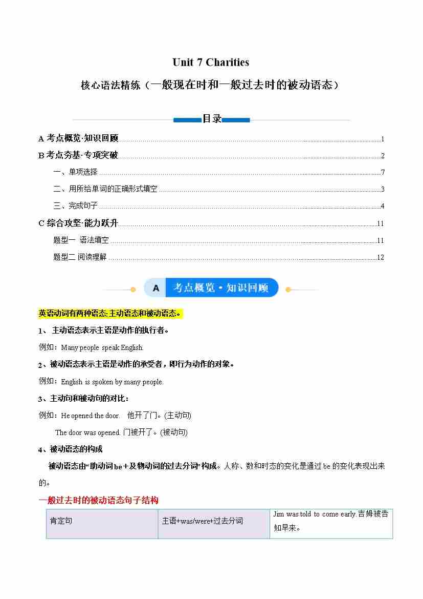 Unit 7 Charities 一般现在时和一般过去时的被动语态(单元核心语法精练)(原卷版)