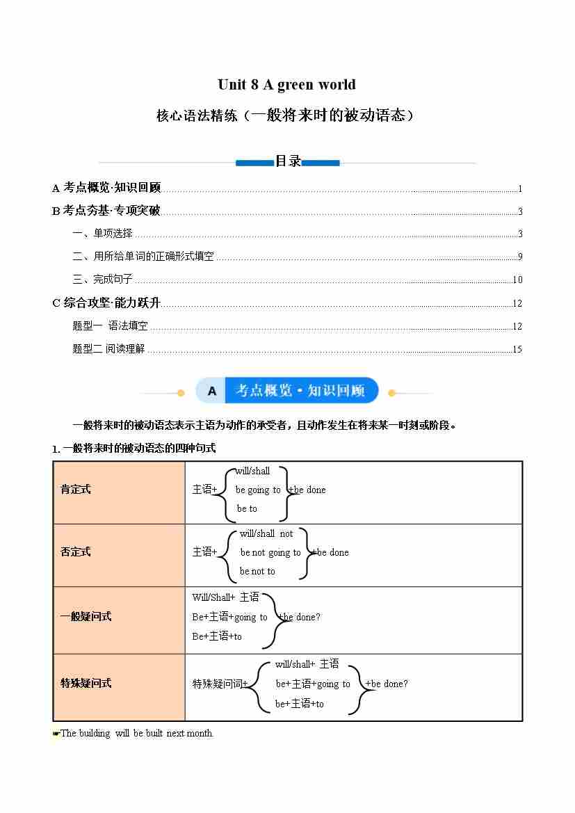 Unit 8 A green world 一般将来时的被动语态(单元核心语法精练)(原卷版)