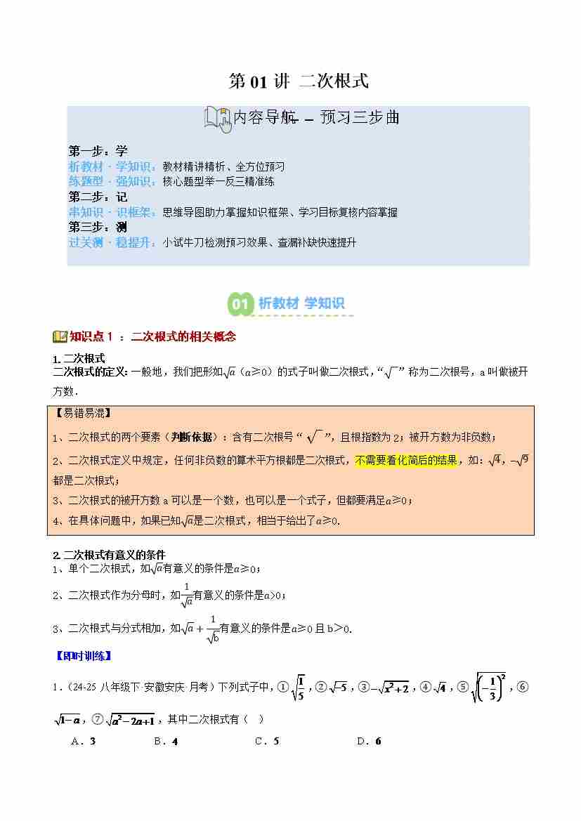 第01讲 二次根式(3个知识点10个题型+思维导图过关测)(寒假预习讲义)(原卷版)