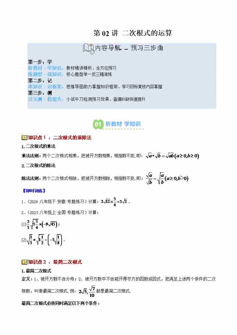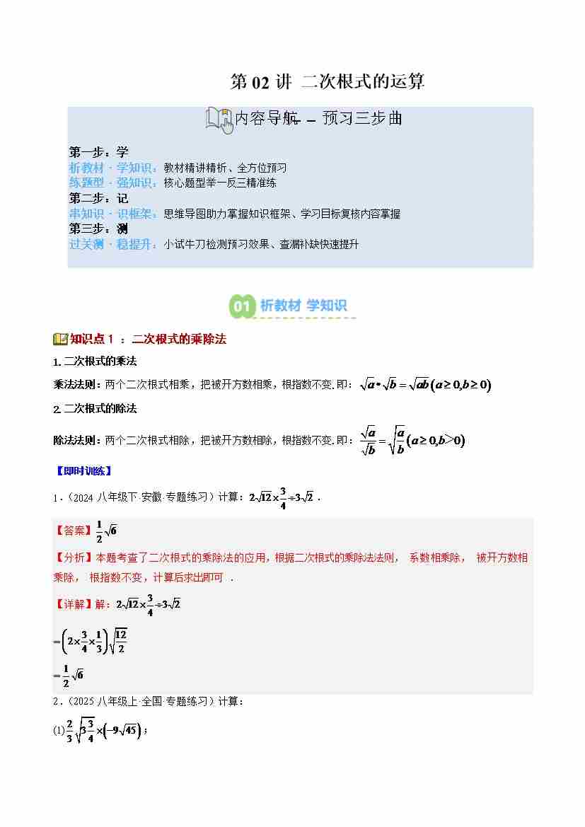 第02讲 二次根式的运算(5个知识点6个题型思维导图过关测)(寒假预习讲义)(解析版)