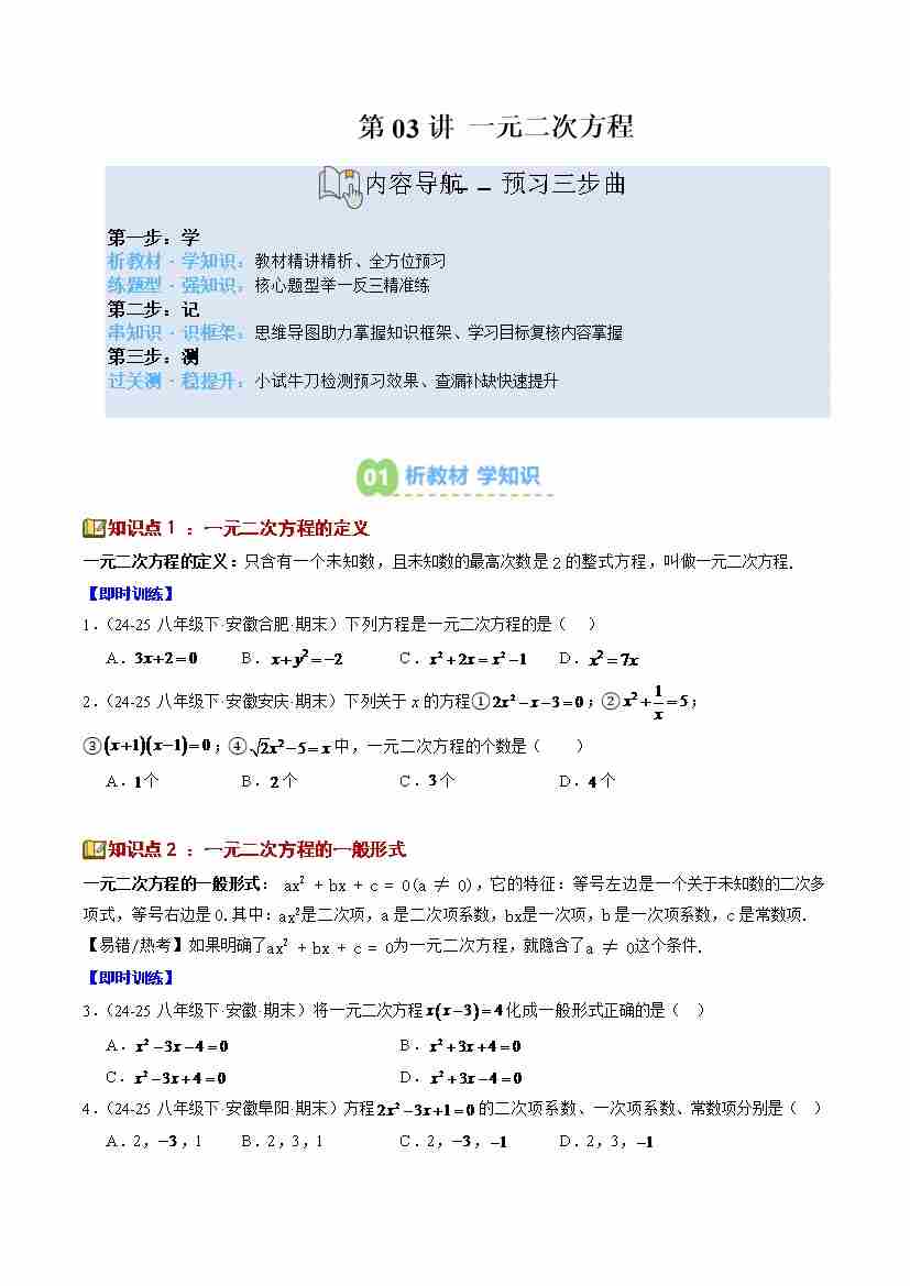 第03讲 一元二次方程(3个知识点7个题型思维导图过关测)(寒假预习讲义)(原卷版)