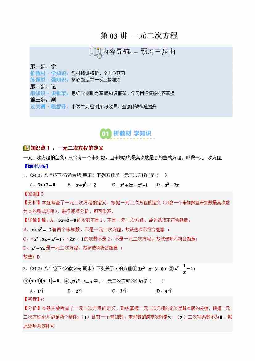 第03讲 一元二次方程(3个知识点7个题型思维导图过关测)(寒假预习讲义)(解析版)