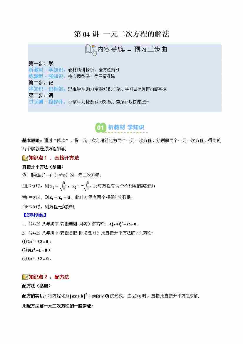第04讲 一元二次方程的解法(4个知识点8个题型思维导图过关测)(寒假预习讲义)(原卷版)