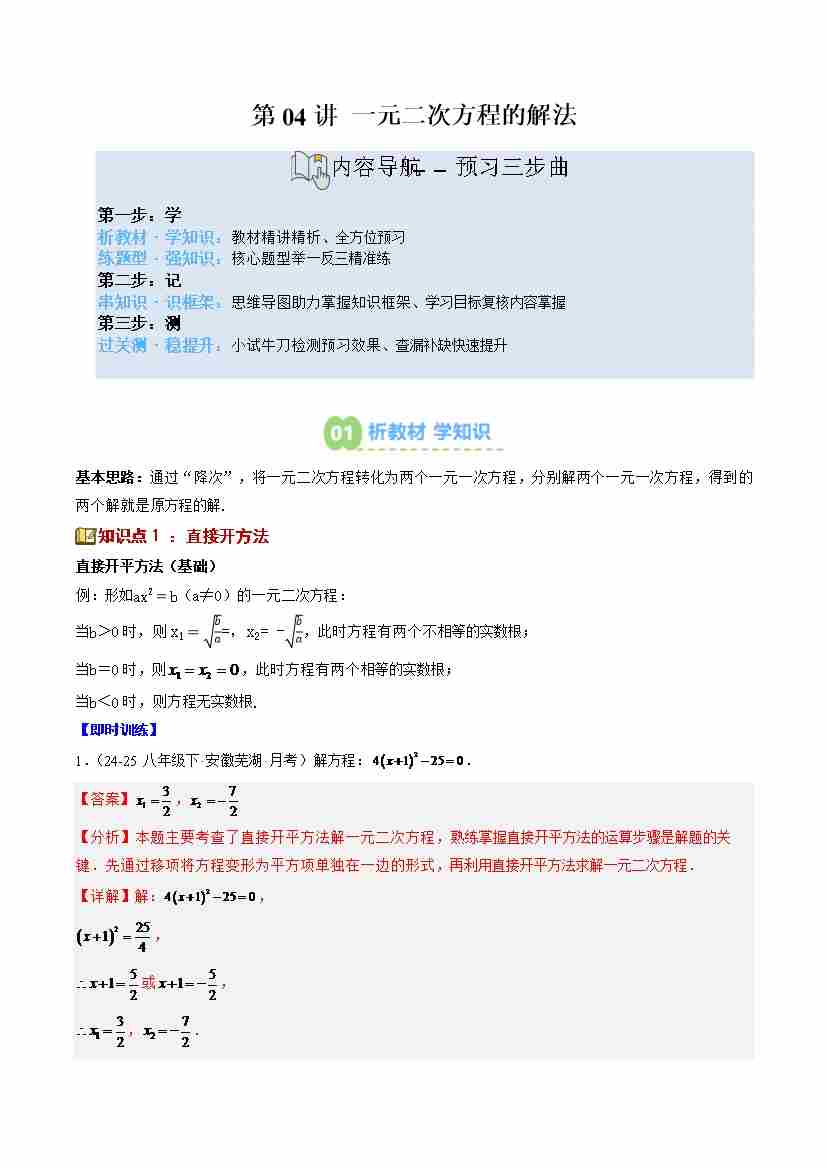 第04讲 一元二次方程的解法(4个知识点8个题型思维导图过关测)(寒假预习讲义)(解析版)