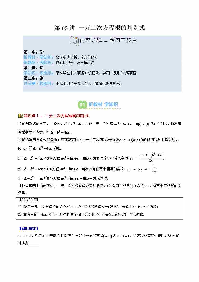 第05讲 一元二次方程根的判别式(1个知识点6个题型思维导图过关测)(寒假预习讲义)(原卷版)