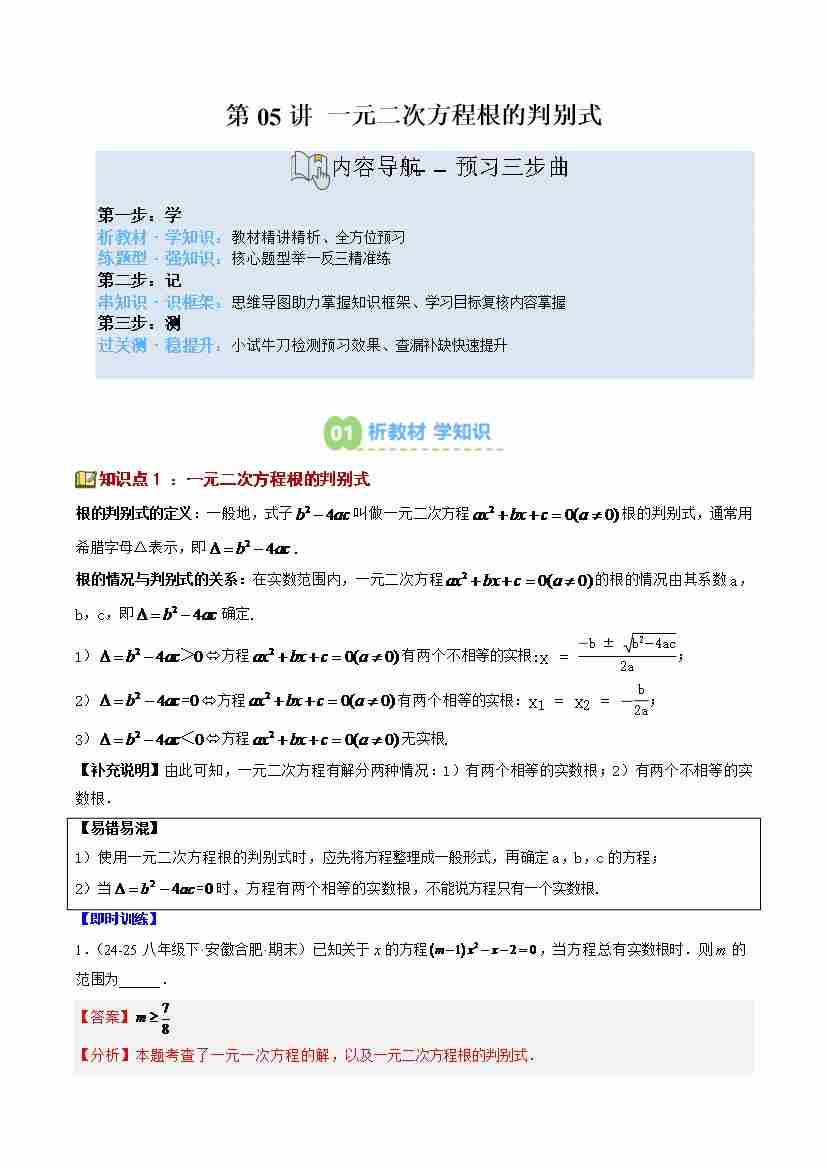 第05讲 一元二次方程根的判别式(1个知识点6个题型思维导图过关测)(寒假预习讲义)(解析版)