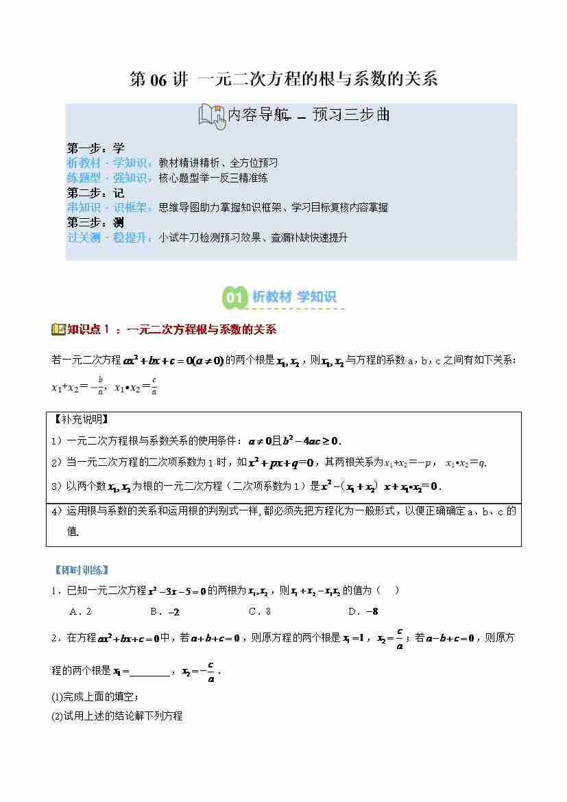 第06讲 一元二次方程的根与系数的关系(1个知识点8个题型思维导图过关测)(寒假预习讲义)(原卷版)