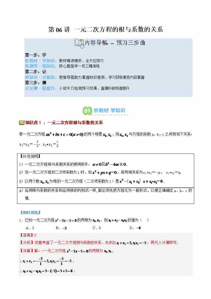 第06讲 一元二次方程的根与系数的关系(1个知识点8大题型思维导图过关测)(寒假预习讲义)(解析版)