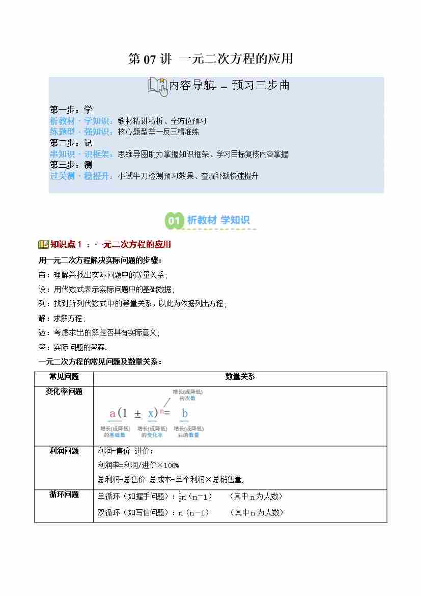 第07讲 一元二次方程的应用(1个知识点12个题型思维导图过关测)(寒假预习讲义)(原卷版)