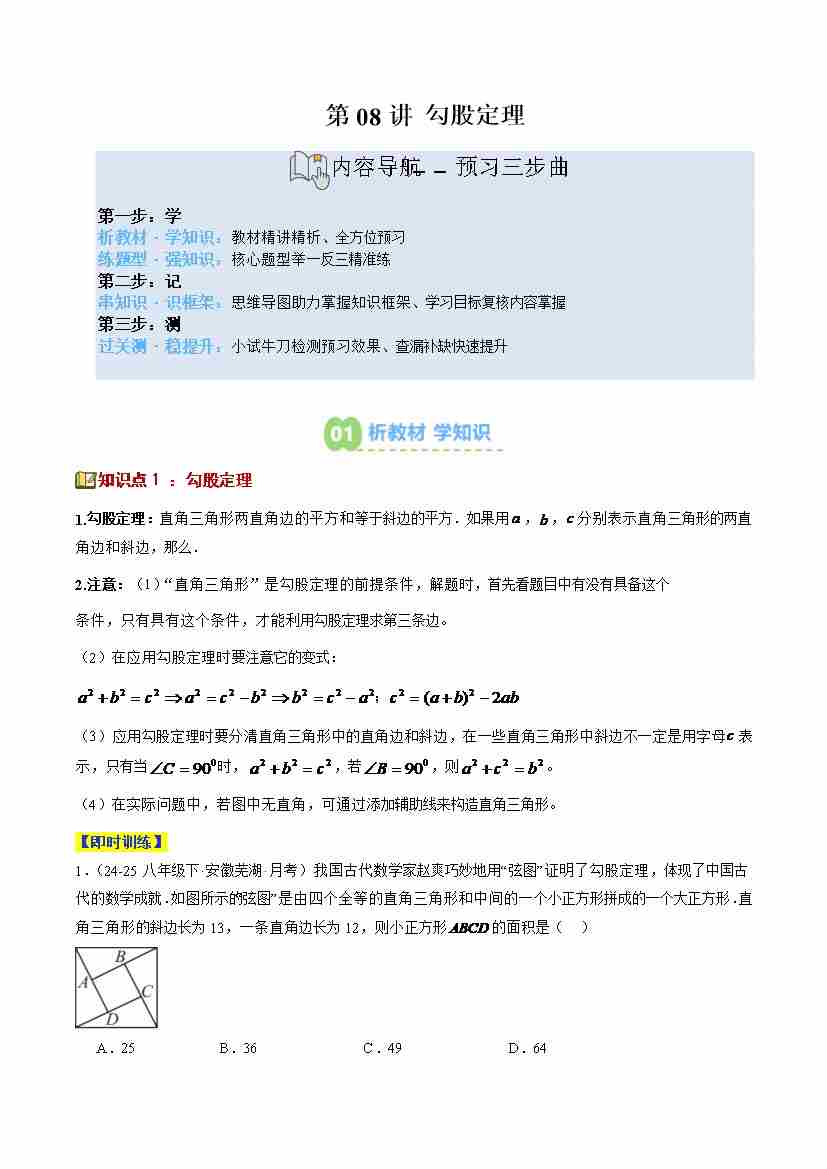 第08讲 勾股定理(4个知识点15个题型思维导图过关测)(寒假预习讲义)(原卷版)