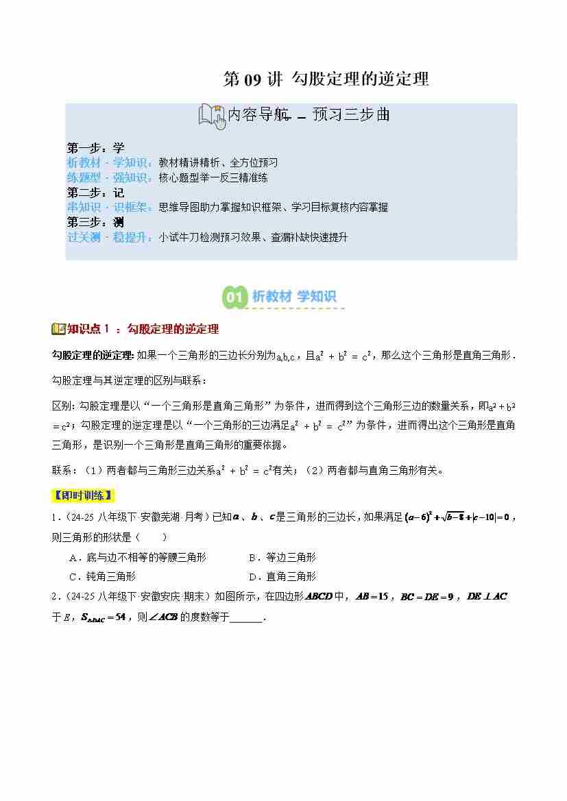 第09讲 勾股定理的逆定理(1个知识点6个题型思维导图过关测)(寒假预习讲义)(原卷版)
