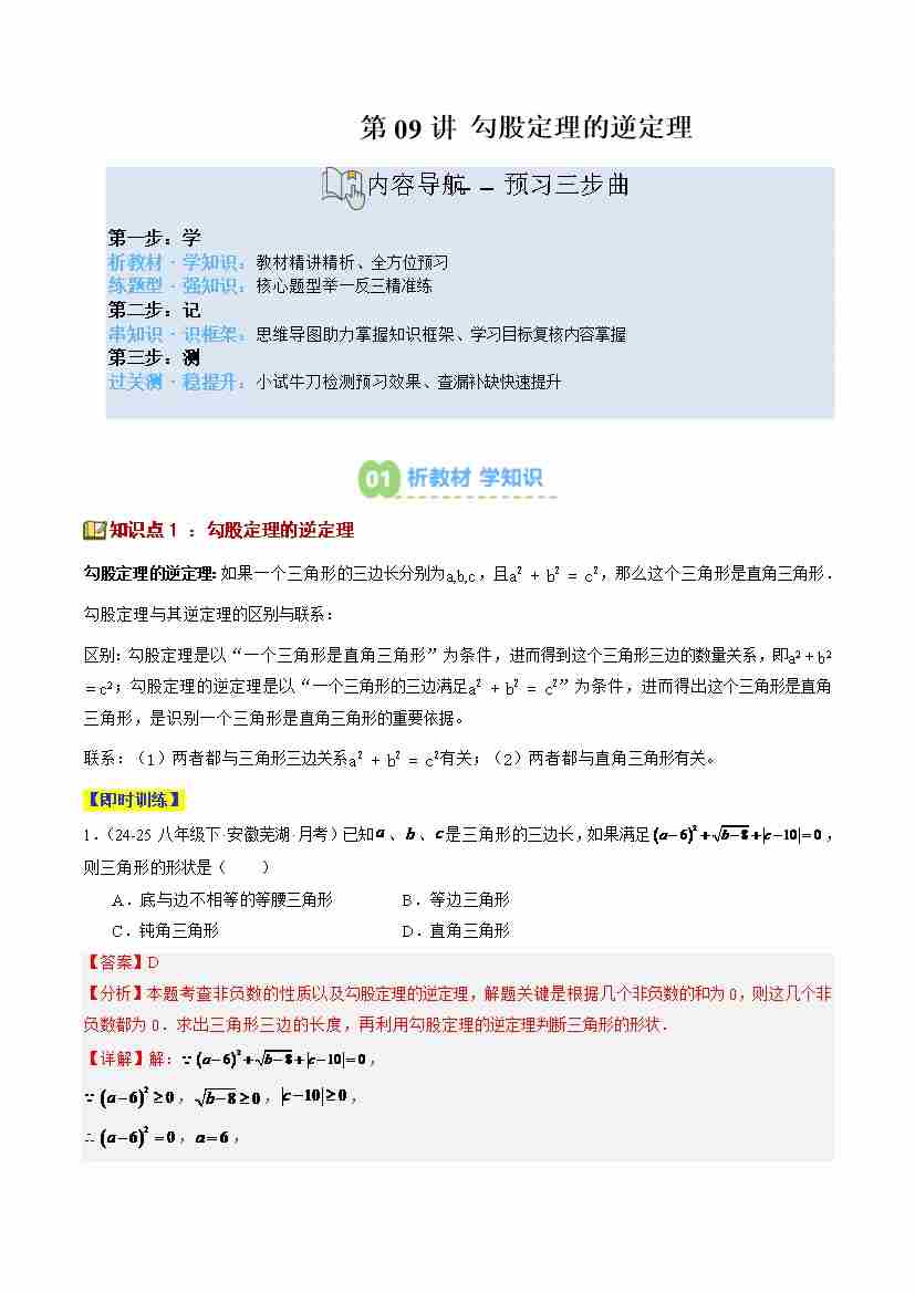 第09讲 勾股定理的逆定理(1个知识点6个题型思维导图过关测)(寒假预习讲义)(解析版)