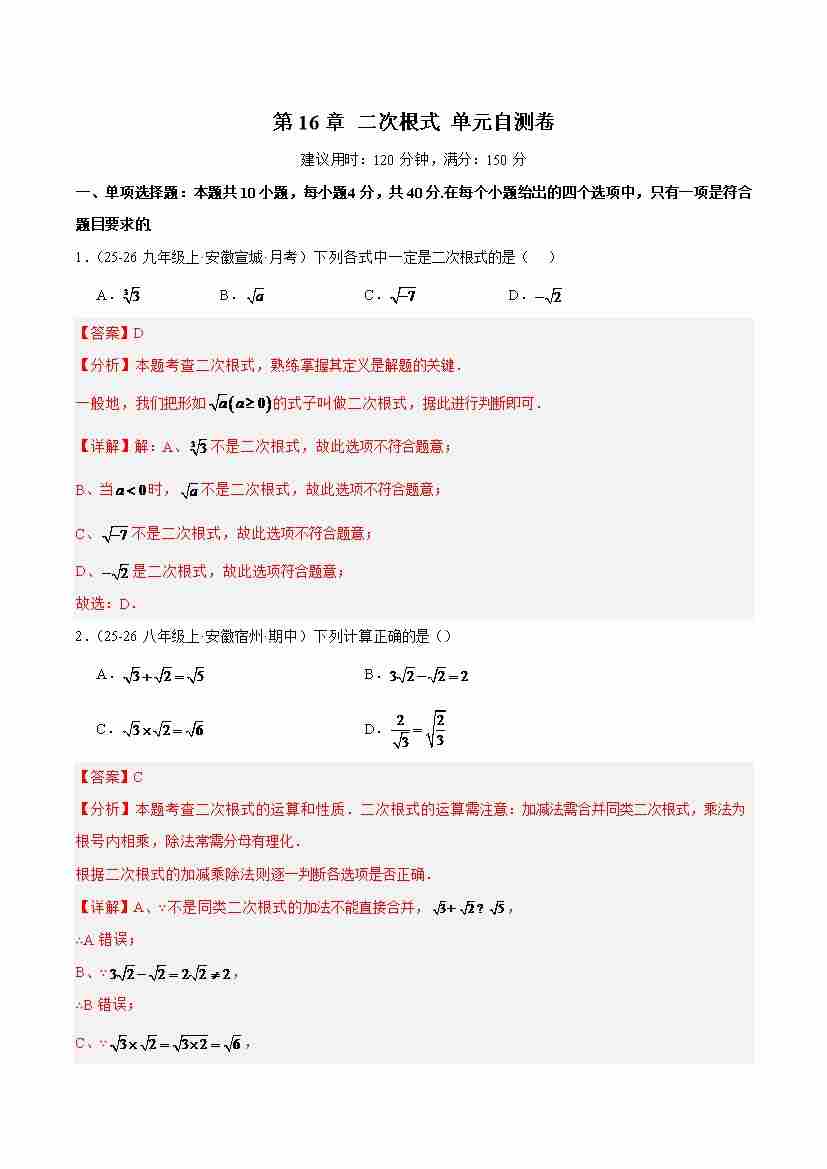 第16章 二次根式(单元自测卷)(解析版)