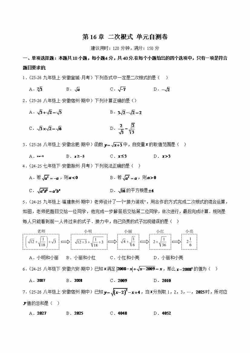 第16章 二次根式(单元自测卷)(原卷版)