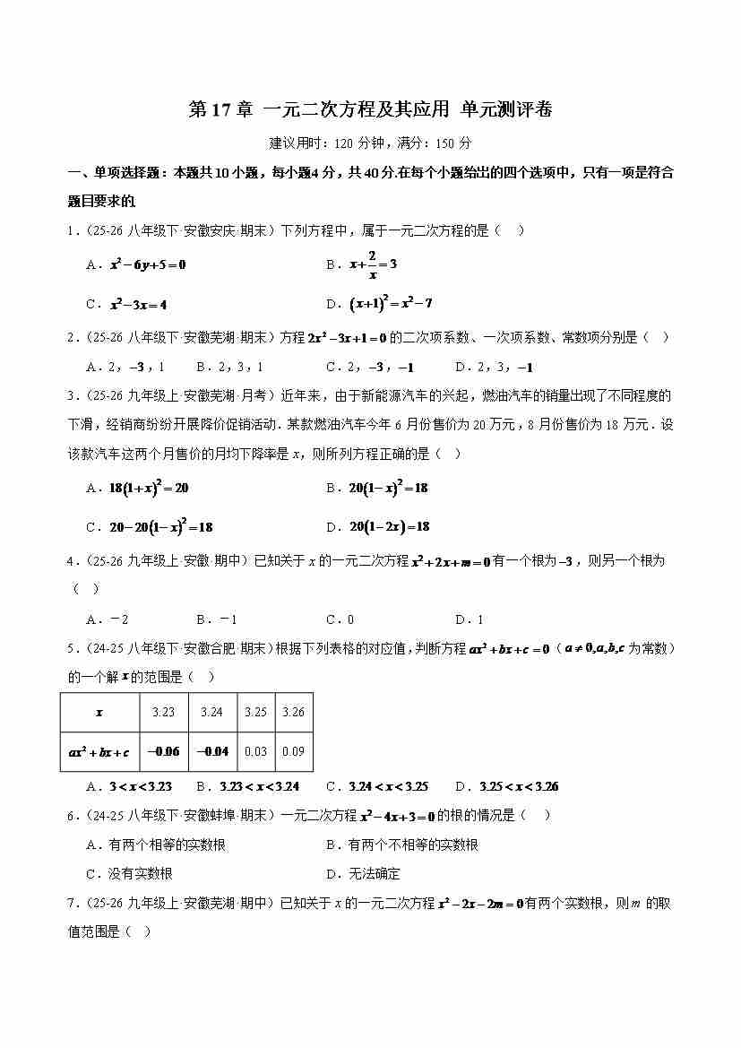 第17章 一元二次方程及其应用(单元测评卷)(原卷版)