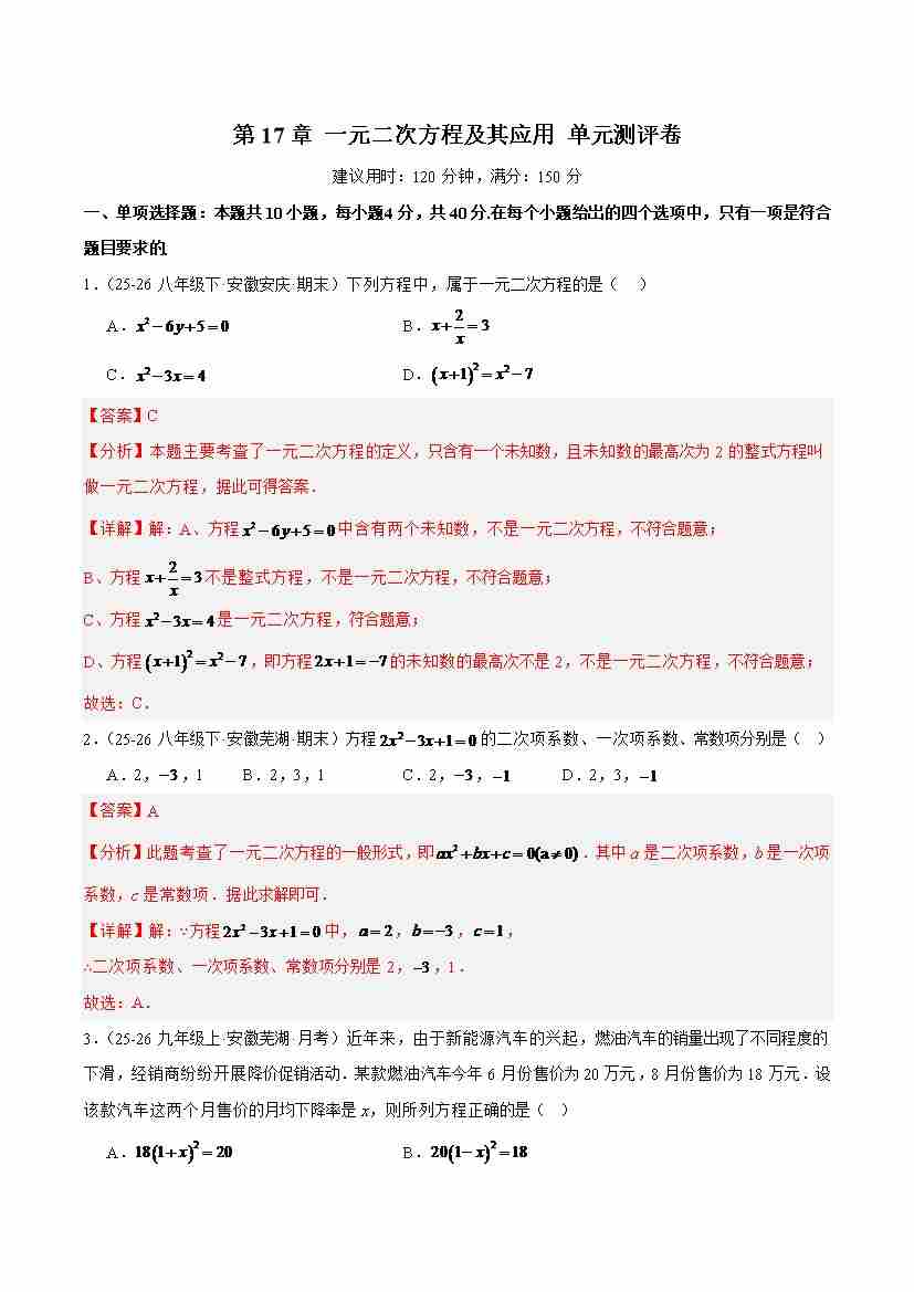 第17章 一元二次方程及其应用(单元测评卷)(解析版)