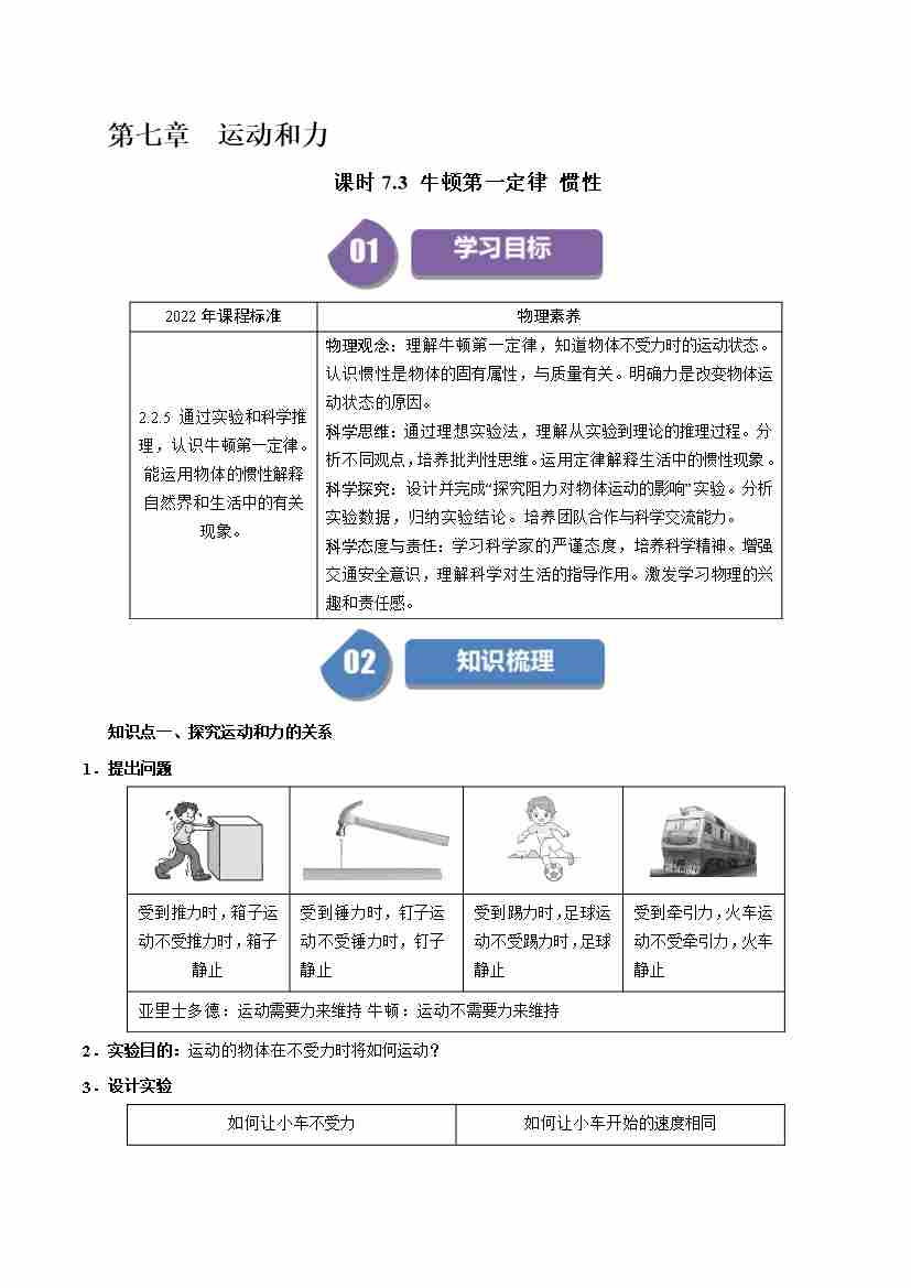 课时7.3 牛顿第一定律 惯性(学生版)