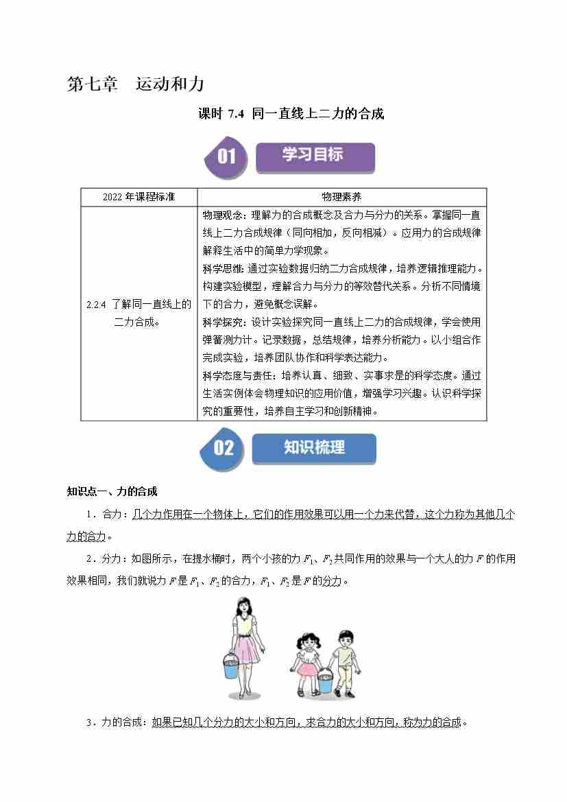 课时7.4 同一直线上二力的合成(学生版)