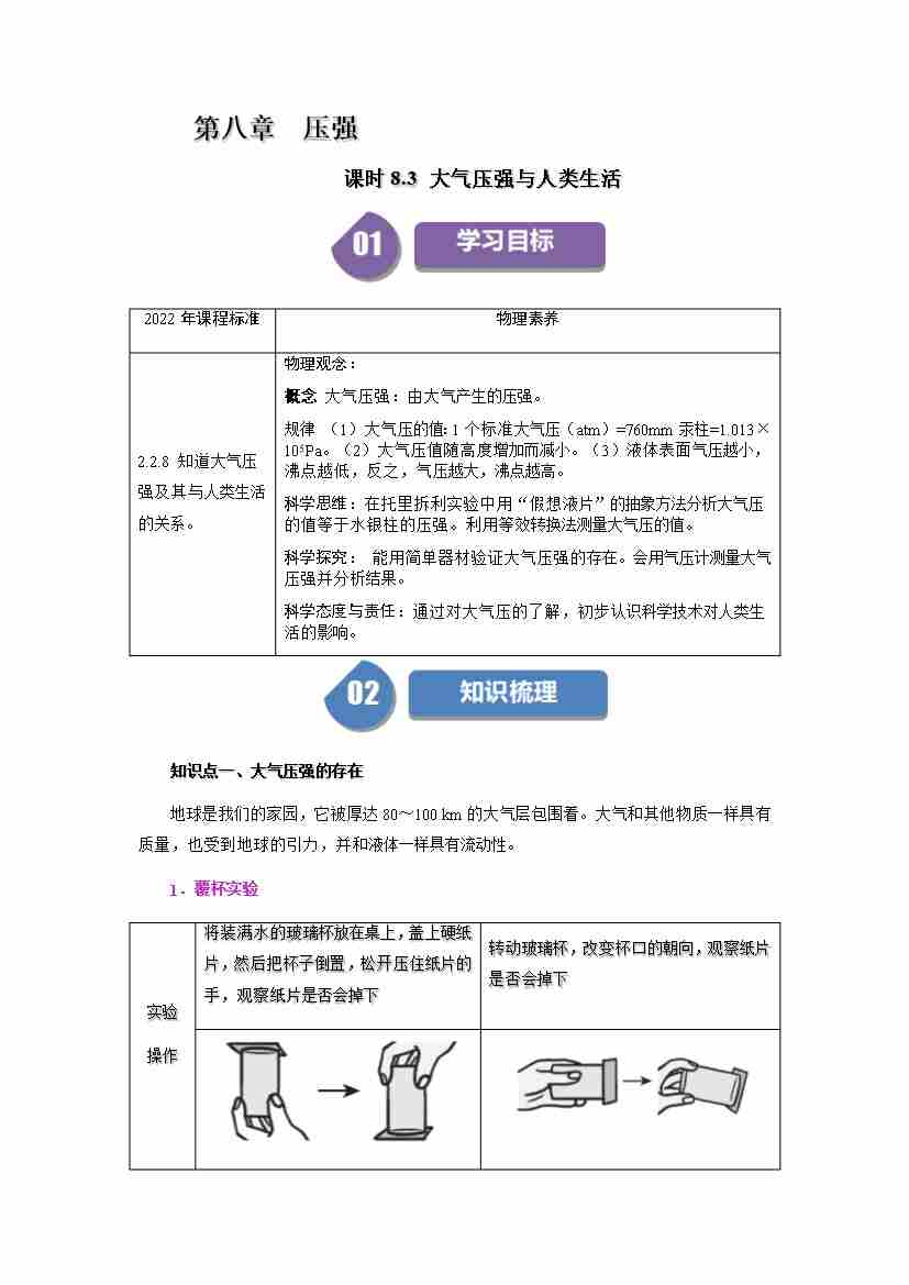 课时8.3 大气压强与人类生活(学生版)