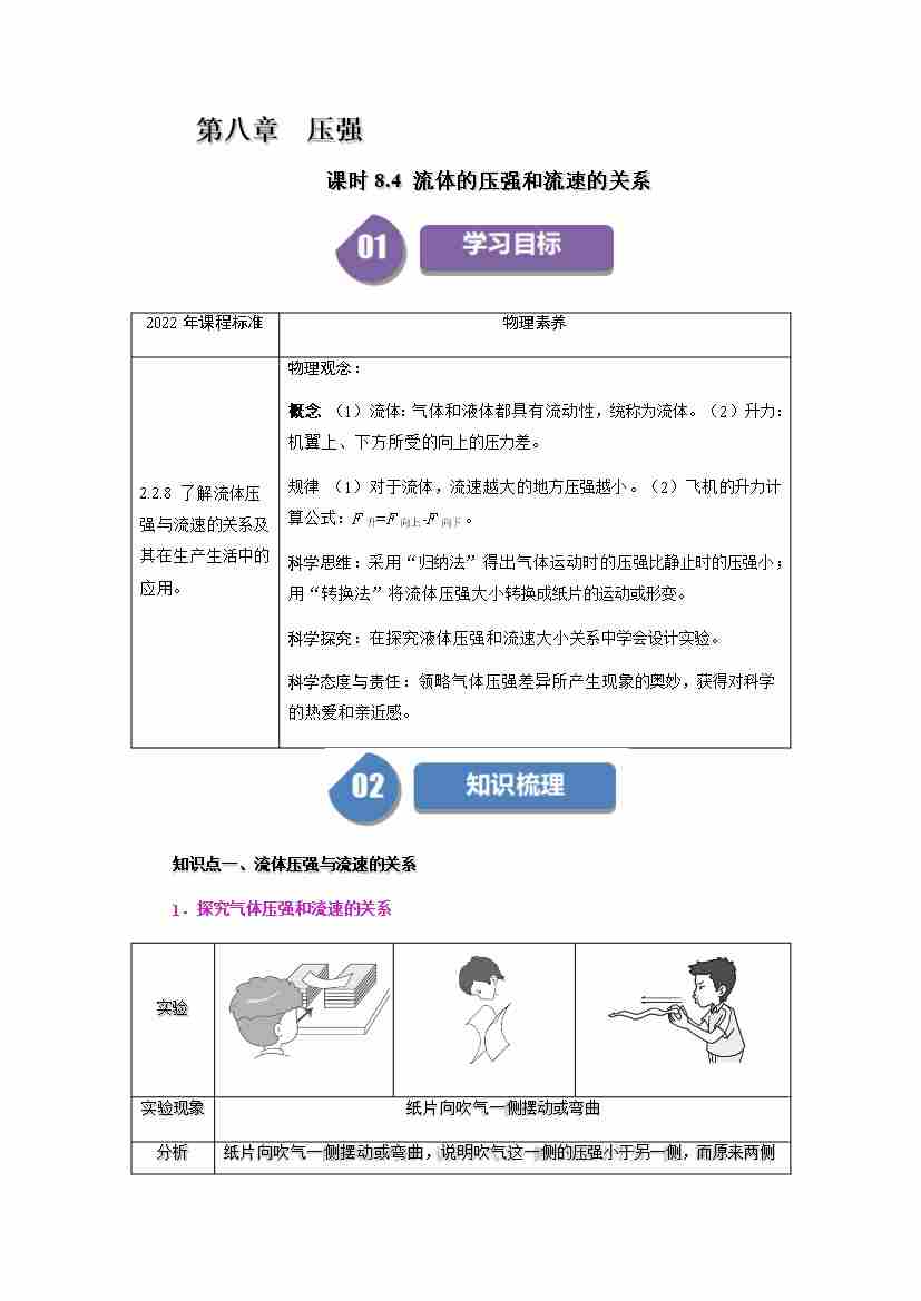 课时8.4 流体的压强和流速的关系(学生版)