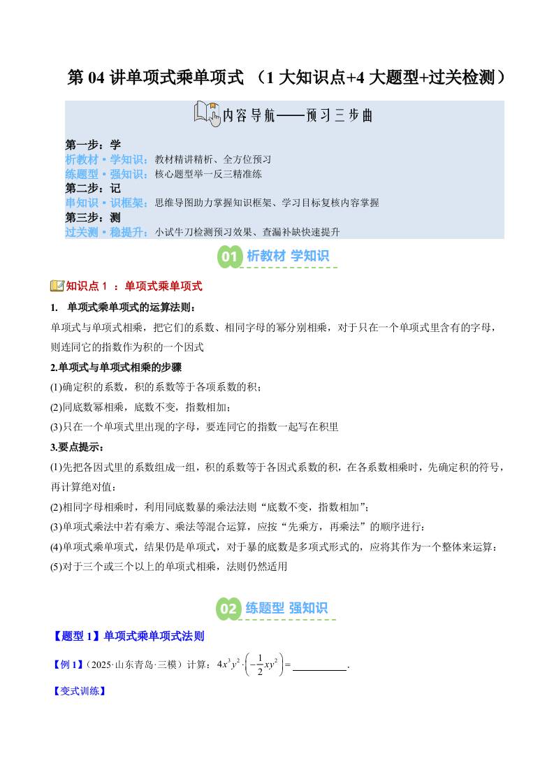 【苏科版】七下数学寒假预习讲义-第04讲:单项式乘单项式(1大知识点4大题型过关检测)(原卷版)
