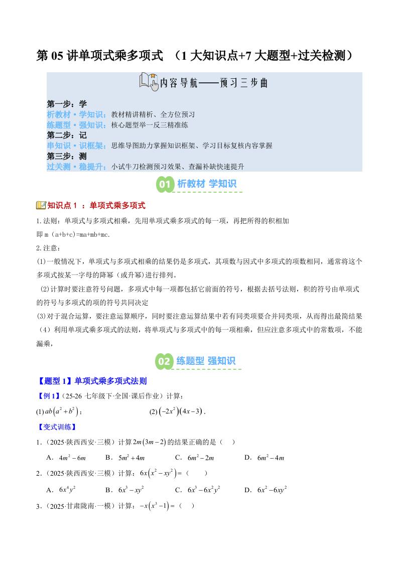 【苏科版】七下数学寒假预习讲义-第05讲:单项式乘多项式(大知识点大题型过关检测)(原卷版)