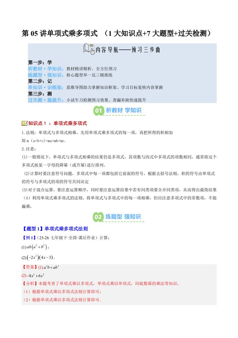 【苏科版】七下数学寒假预习讲义-第05讲:单项式乘多项式(大知识点大题型过关检测)(解析版)