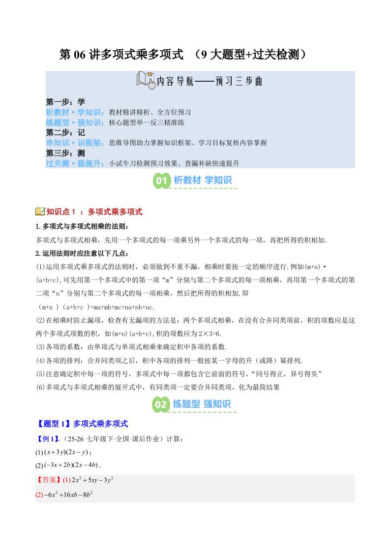 【苏科版】七下数学寒假预习讲义-第06讲:多项式乘多项式(9大题型过关检测)(解析版)