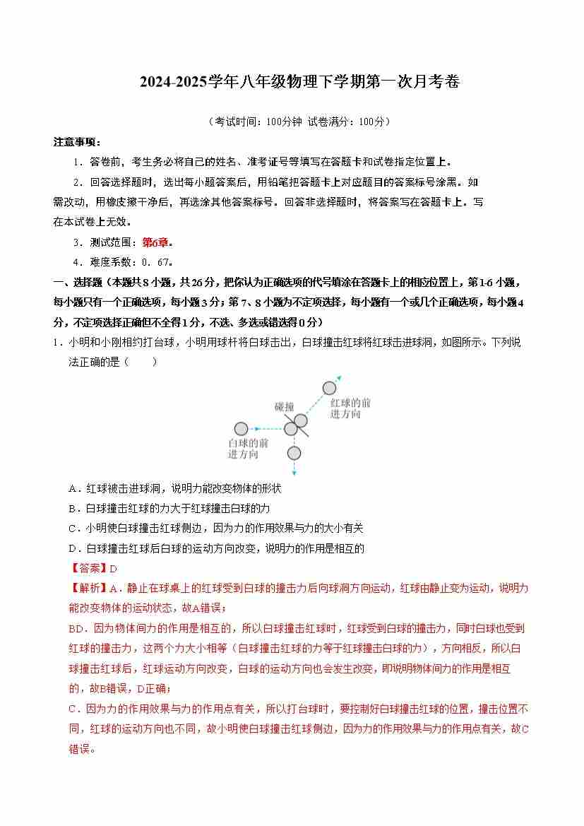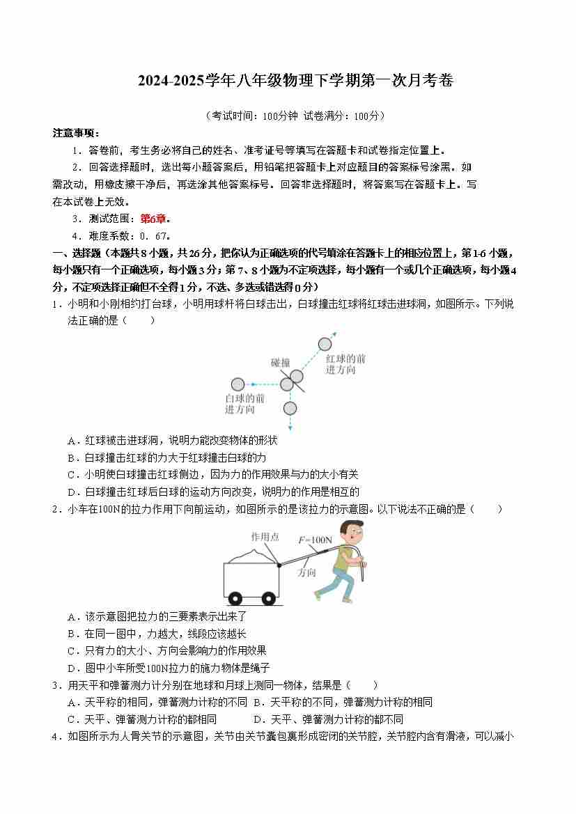 八年级物理第一次月考卷(考试版A4)【测试范围:沪粤版2024,第6章】