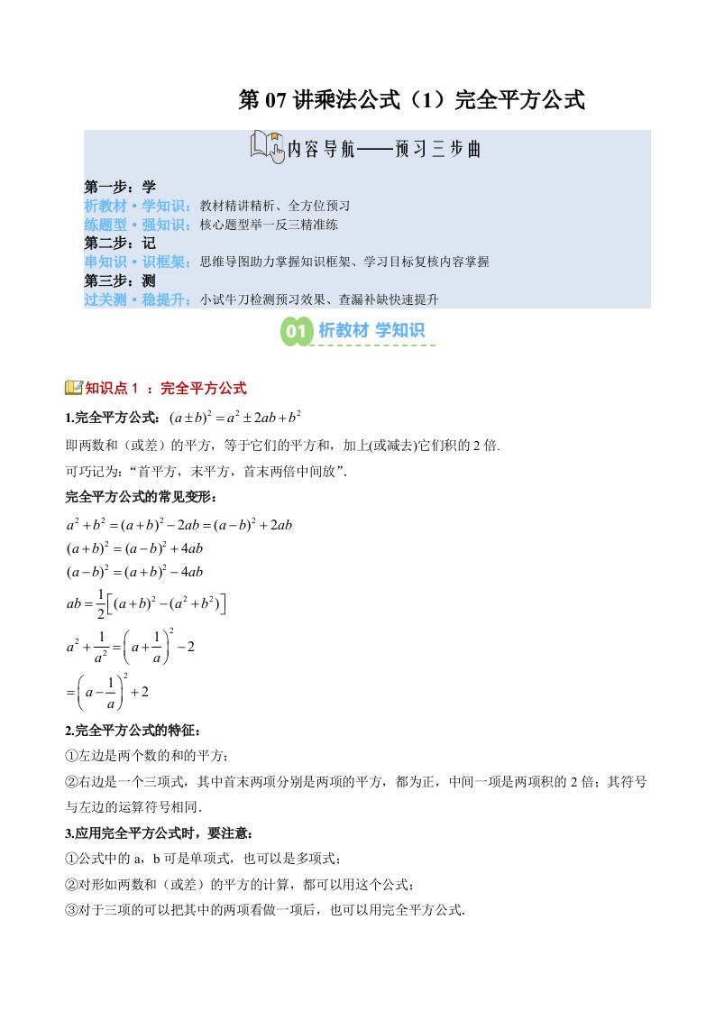【苏科版】七下数学寒假预习讲义-第07讲:乘法公式(1)完全平方公式(2大知识点8大题型过关检测)(解析版)