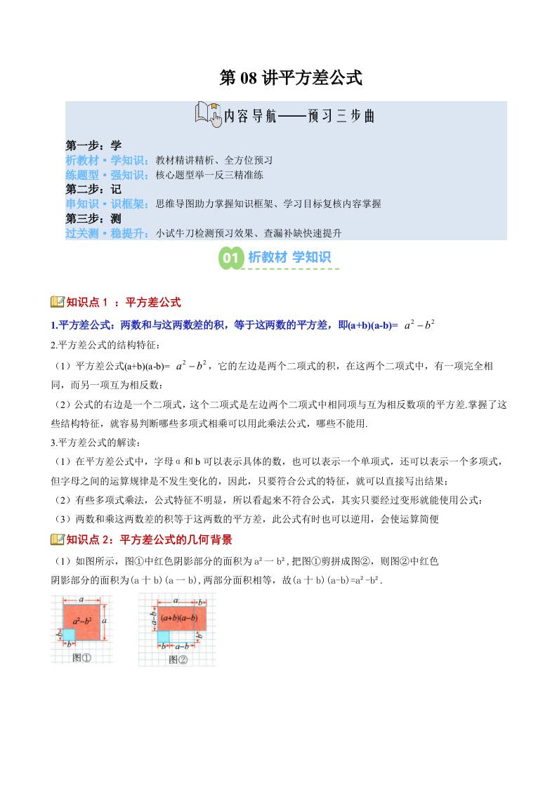 【苏科版】七下数学寒假预习讲义-第08讲:乘法公式(2)平方差公式(大知识点大题型过关检测)(解析版)