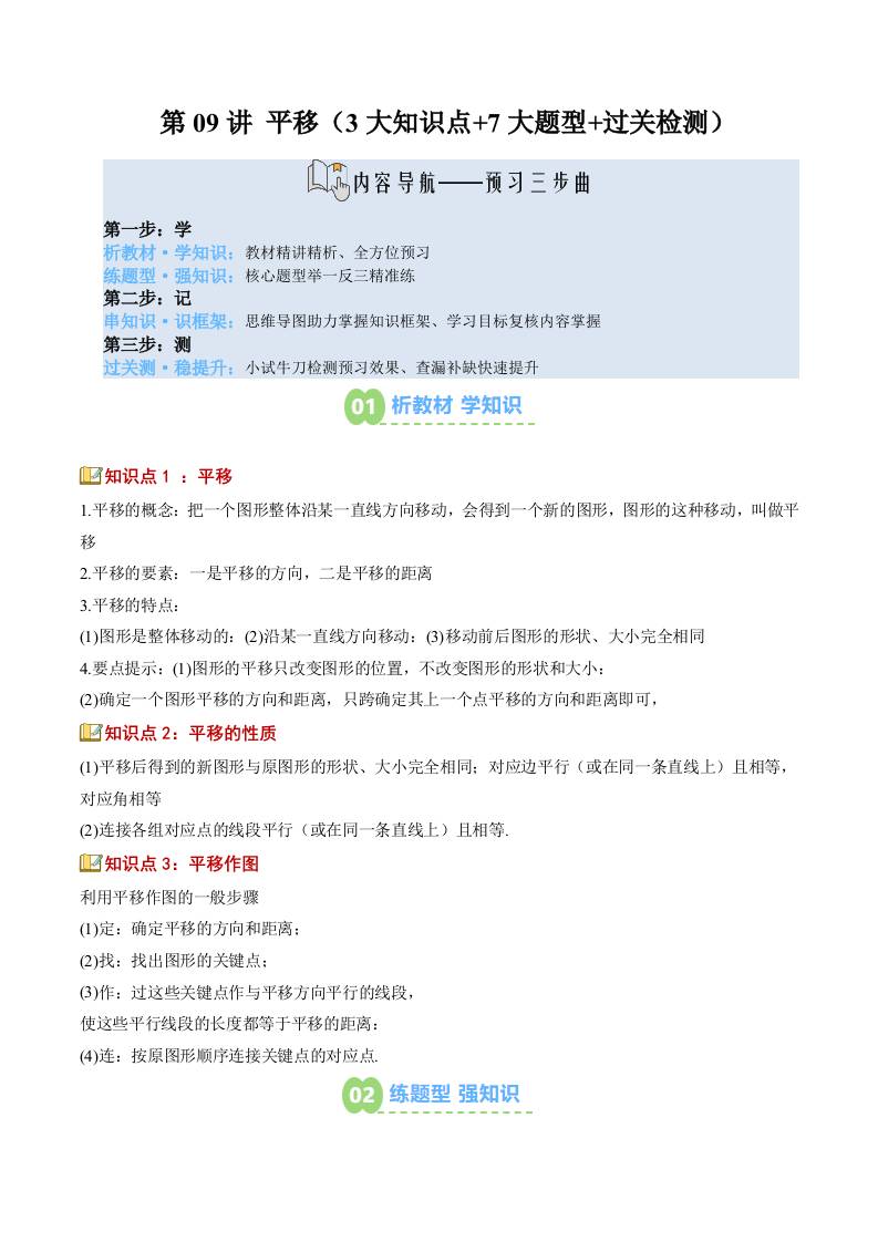 【苏科版】七下数学寒假预习讲义-第09讲:平移(3大知识点7大题型过关检测)(原卷版)