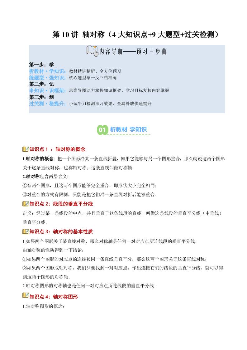 【苏科版】七下数学寒假预习讲义-第10讲:轴对称(4大知识点9大题型过关检测)(原卷版)