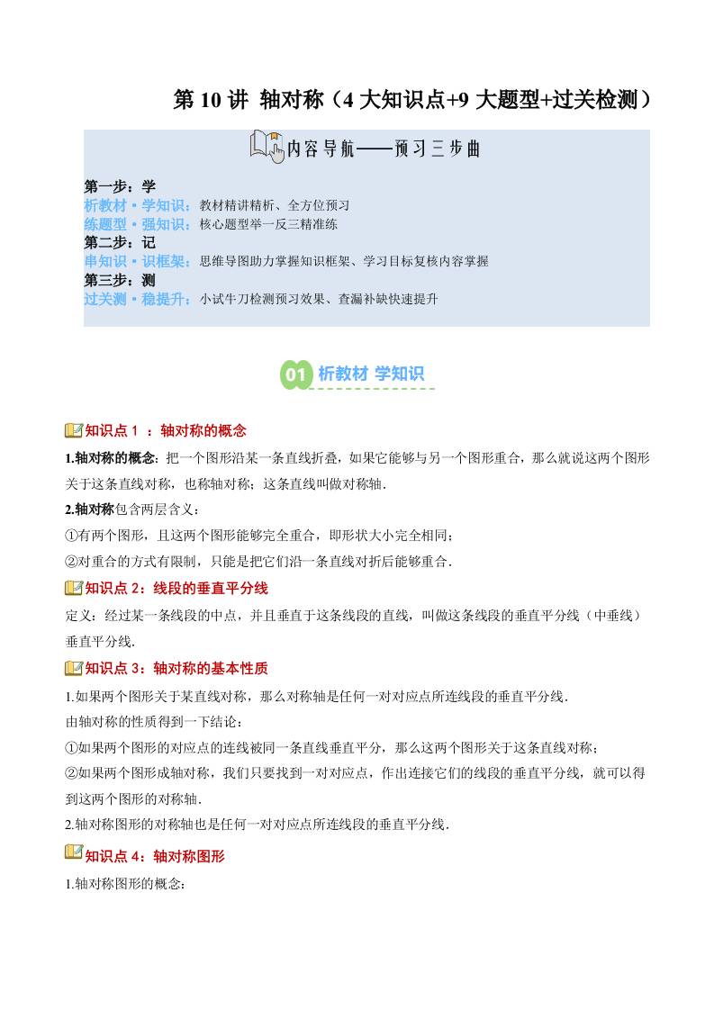 【苏科版】七下数学寒假预习讲义-第10讲:轴对称(大知识点大题型过关检测)(解析版)