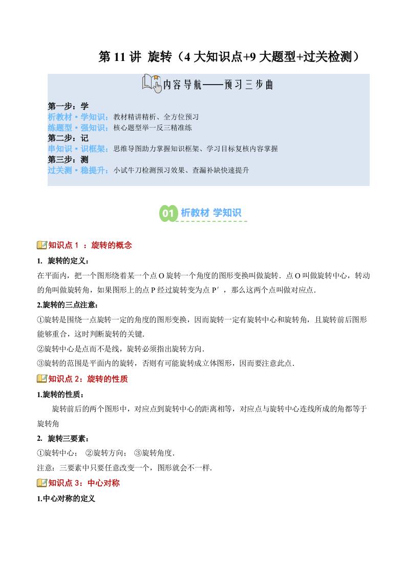 【苏科版】七下数学寒假预习讲义-第11讲:旋转(4大知识点8大题型过关检测)(原卷版)
