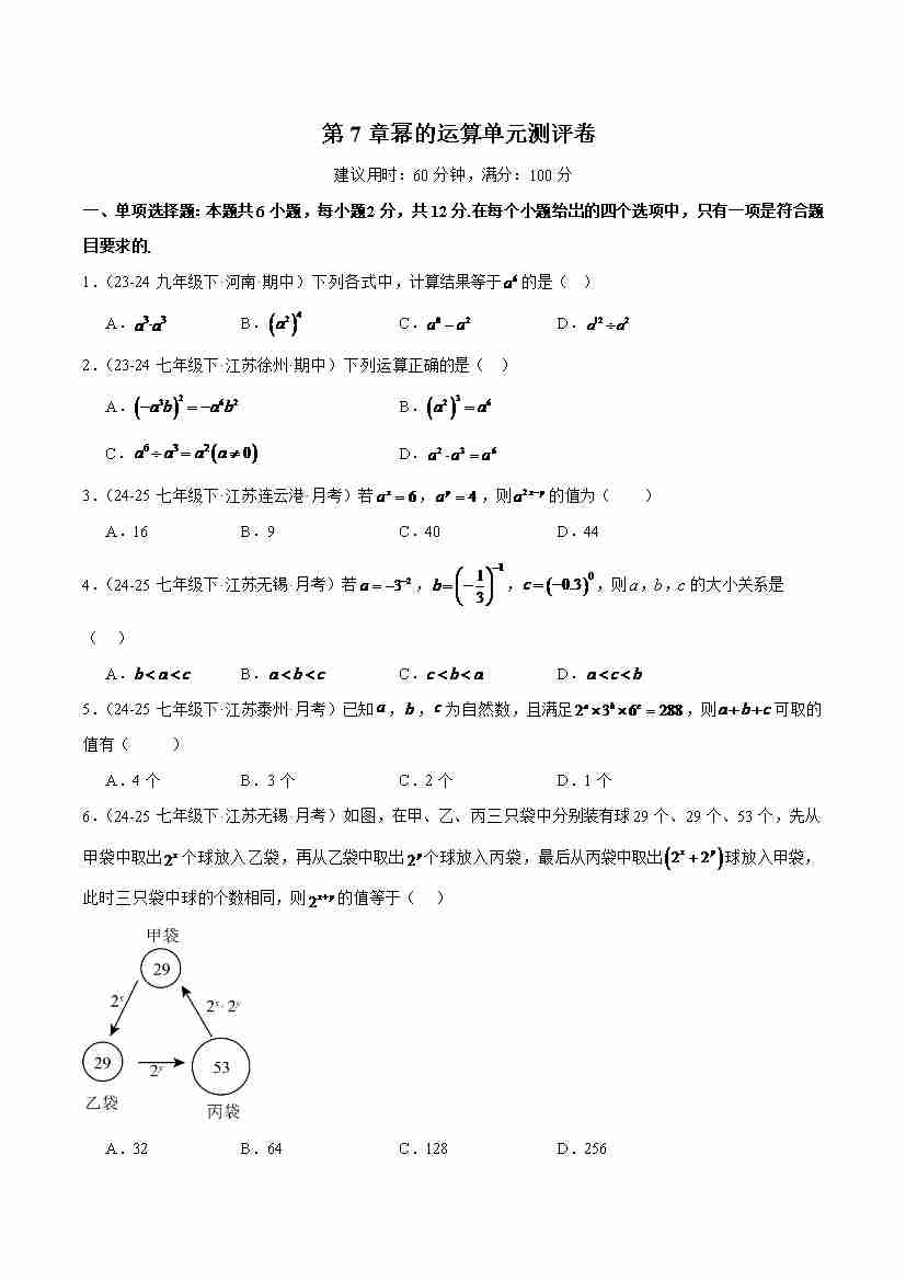 【苏科版】七年级数学下册-第7章:幂的运算(单元测评卷)(原卷版)