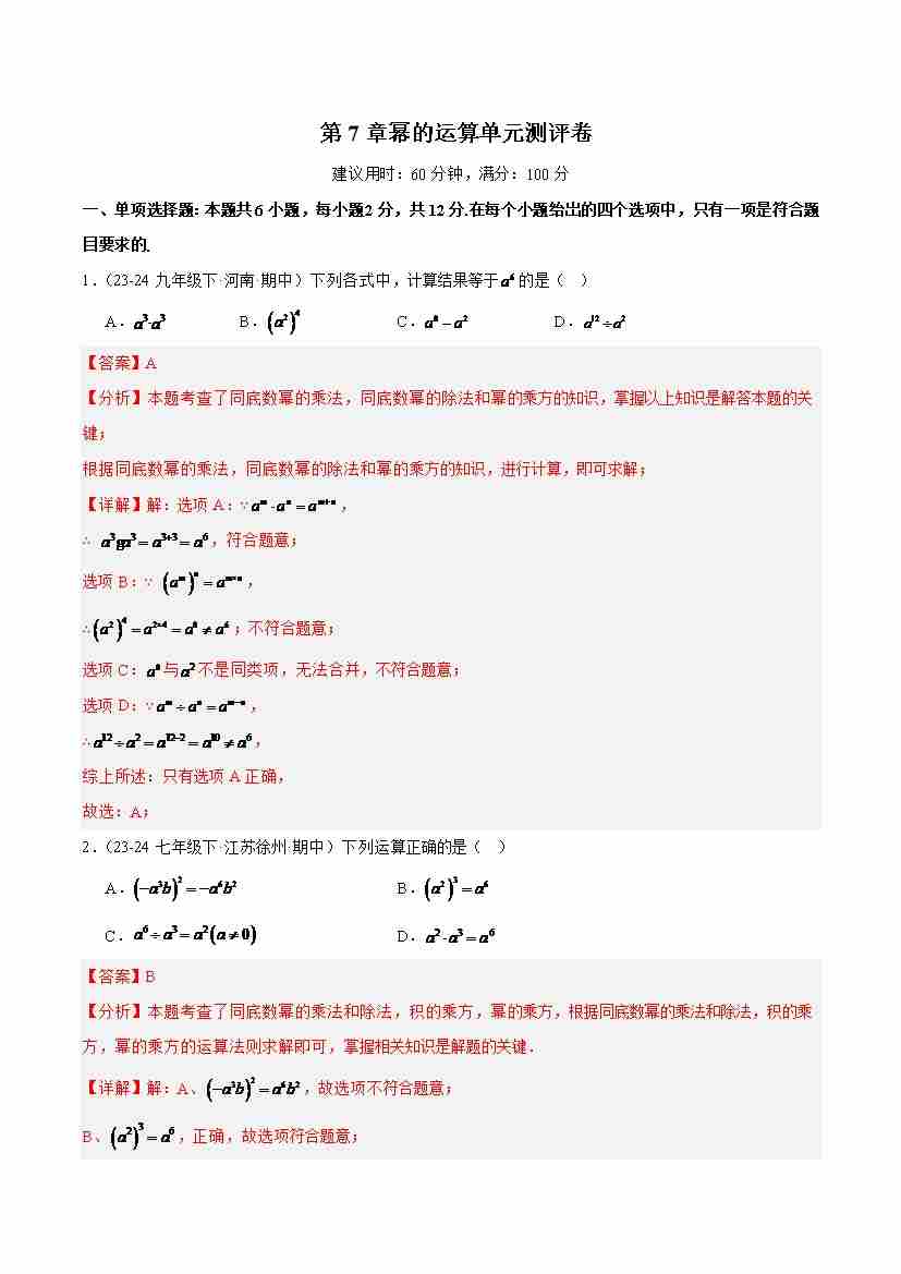【苏科版】七年级数学下册-第7章:幂的运算(单元测评卷)(解析版)
