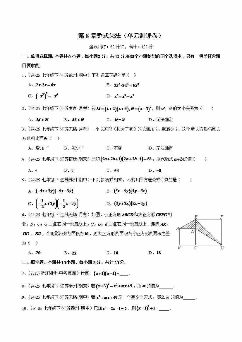 【苏科版】七年级数学下册-第8章:整式乘法(单元测评卷)(原卷版)