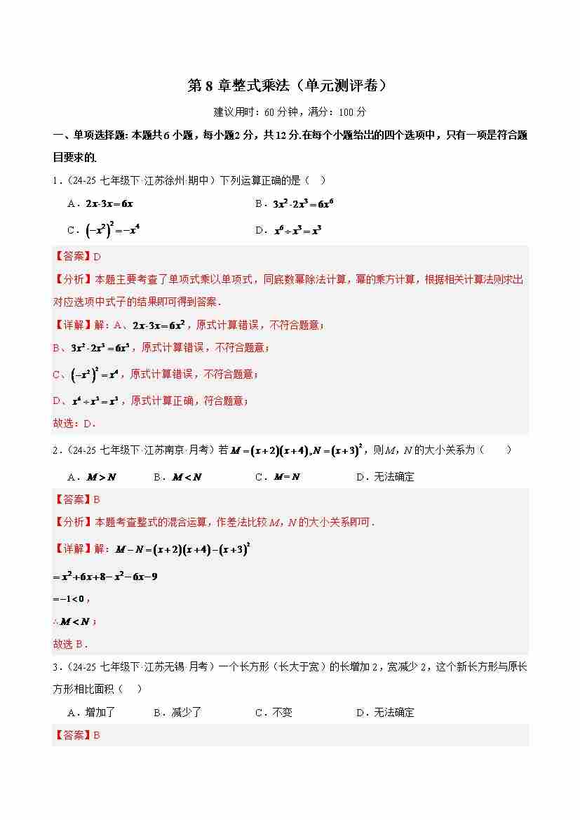 【苏科版】七年级数学下册-第8章:整式乘法(单元测评卷)(解析版)